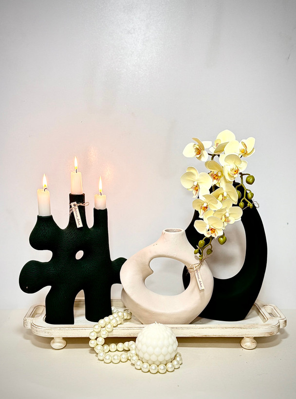 وجود شمعدان درختی با شمعهای کوچک، حالوهوایی گرم و دلنشین به چیدمان میبخشد و فضا را از سادگی به سبکی خاص و هنری تبدیل میکند.