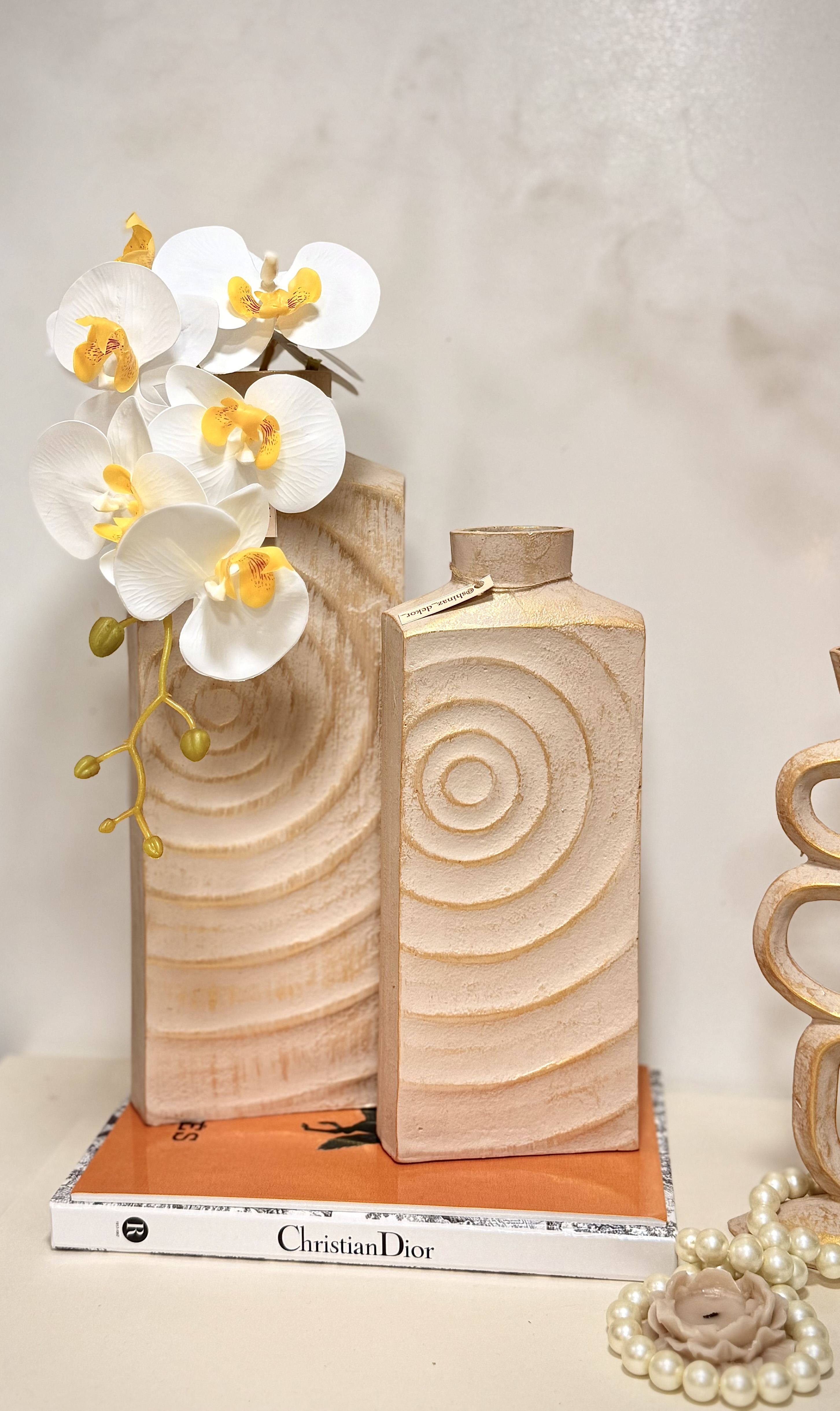 نمای نزدیک گلدان هارمونی با پتینه طلایی و گل ارکیده سفید