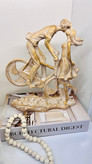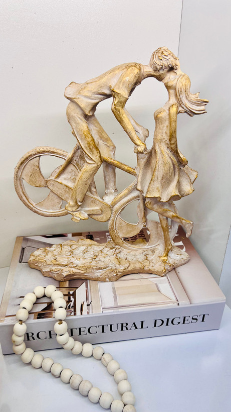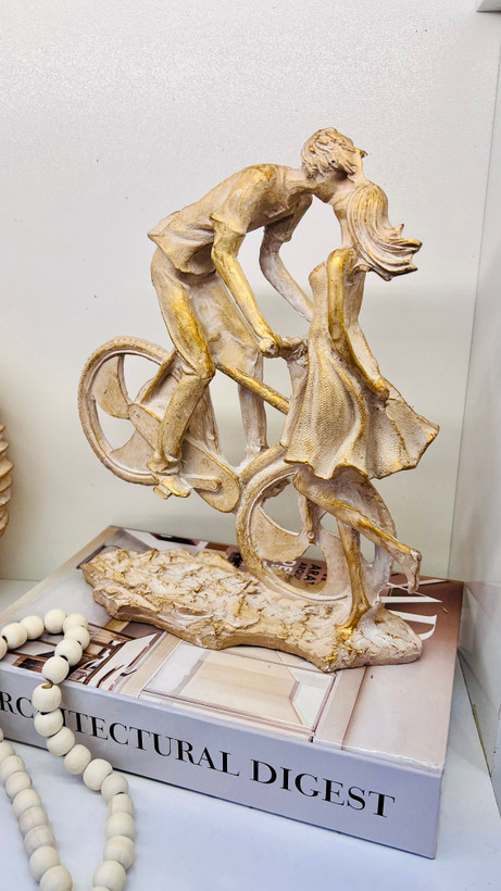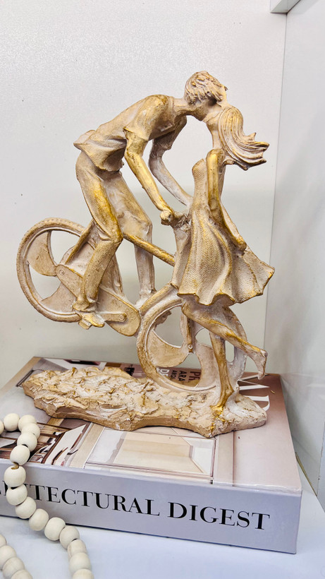 این تندیس از آن دسته آیتمهایی است که با یک نگاه، حس گرما و عشق را به فضای شما میآورد. فرم دینامیک دوچرخهسواری، ترکیب حالت چهرهها، و حرکت موهای زن با جزئیات بینقص طراحی شده. رنگ طلایی کهنهشده (پتینه) جلوهای اصیل و هنری دارد که آن را از سایر مجسمههای معمولی متمایز میکند. این محصول نه فقط یک دکوری، بلکه یک داستان عاشقانهای مجسمشده است.